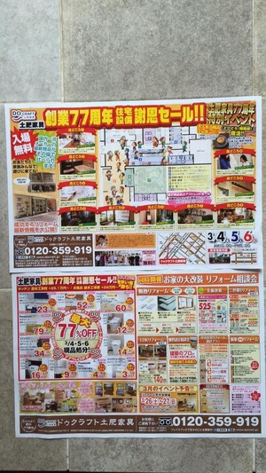 「77周年・住宅設備売り尽くしセール!!」と「リフォーム相談会」二本立て!! 2016/02/26 スタッフ日記 こんにちは。 まだまだ寒いですが、空模様が明るいので気持ちが弾みます。 今日からドゥクラフト土肥家具は「77周年・住宅設備売り尽くしセール!」と「リフォーム相談会」の二本立てです。 &n...
