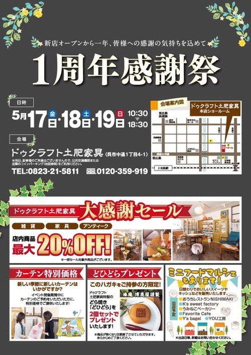 ドゥクラフト土肥家具 ★1周年感謝祭1日目 2019/05/17 イベント情報 こんばんは。 今日は「ドゥクラフト土肥家具 ★1周年感謝祭」初日でした。 平日ということもあり、比較的ゆっくりしたスタートでしたが沢山のお客様にご来店いただきました。 思いがけなくお祝いのお花やお菓子...