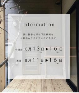 8月13日(日)~16日(水)をお休みといたします。 17日(木)からは通常営業になります。