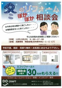 12月15日(木)に 呉郵便局 特設会場にて 「冬のリフォームぽかぽか相談会」 を開催します。 「今年の冬は暖かく過ごしたい・・」 「暖房費をもっと安くしたい・・・」などのお悩みをご相談ください。 経...