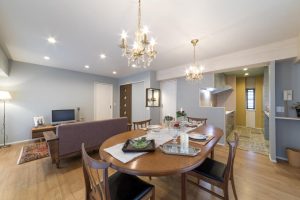 築44年のヴィンテージマンションを弊社のモデルルームとしてリノベーションしました。キッチンを眺めの良いバルコニー側へ移動し、玄関側に収納スペースを設置することにより、ぐるぐると周遊できるような間取りと...
