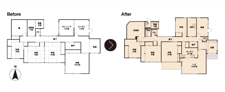 カラリとした音楽室に。庭を観れる応接室はLDKに間取り変更し、続きの和室は寝室に。