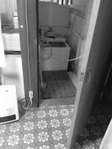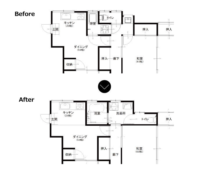 80年前の間取りは現代の水廻りプランとは異なります。ご希望を実現するために基礎補強工事とともに一畳程度の増築も行いました。