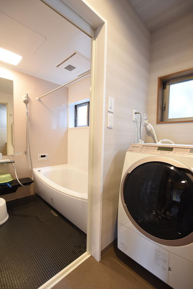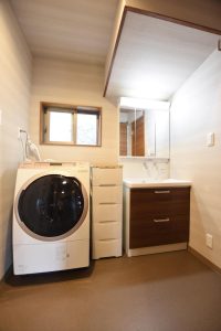ご主人のご希望は今より広い浴槽のユニットバスを設置すること、奥様のご希望は洗面室を設けることと使いやすい洗濯機置場を作ること。