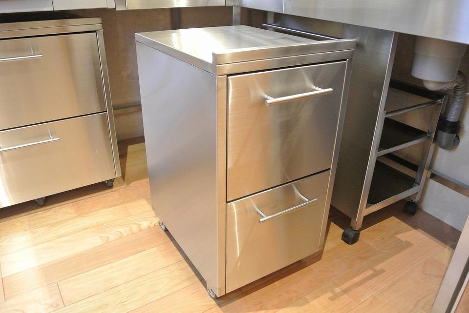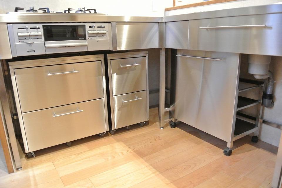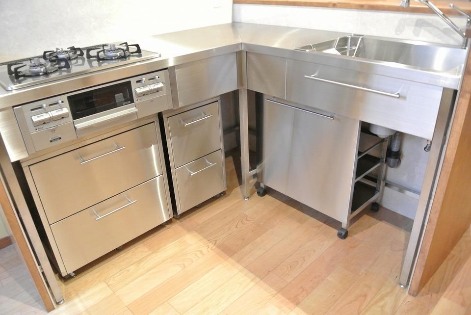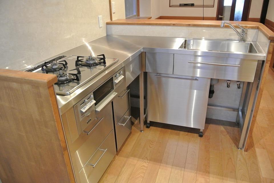 縦長の間取りでメーカーのキッチンが入らず対面キッチンが難しかったので、ステンレス