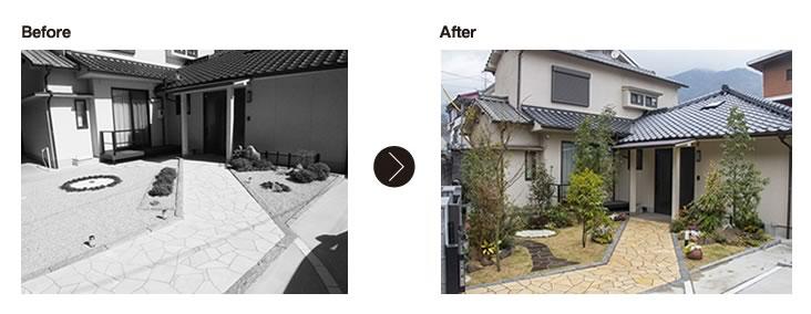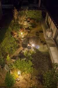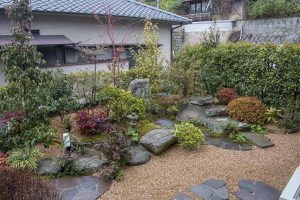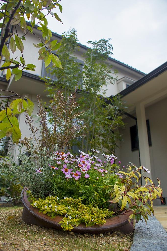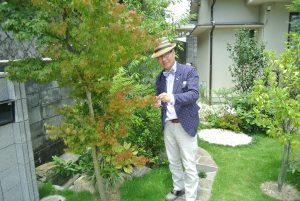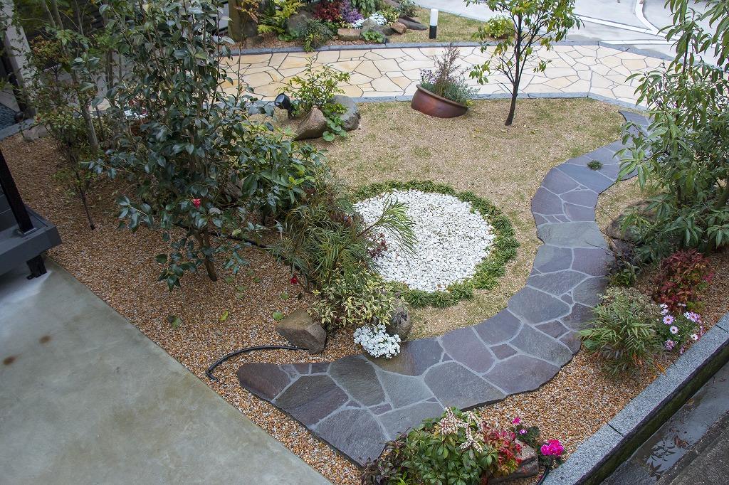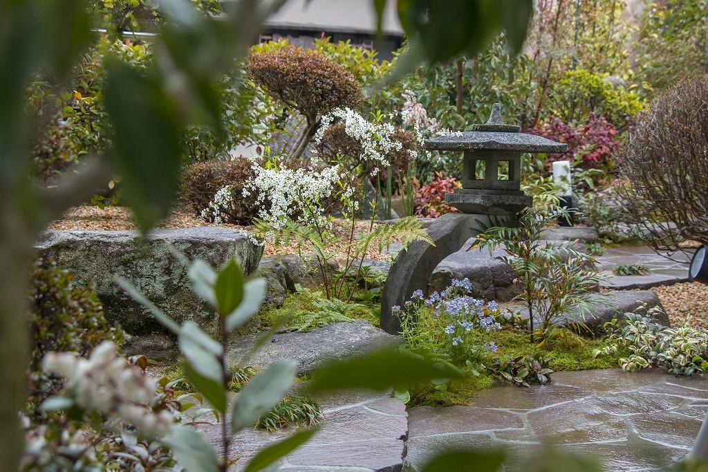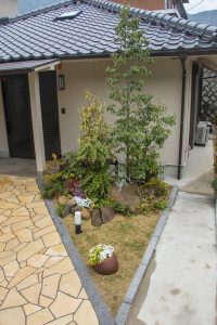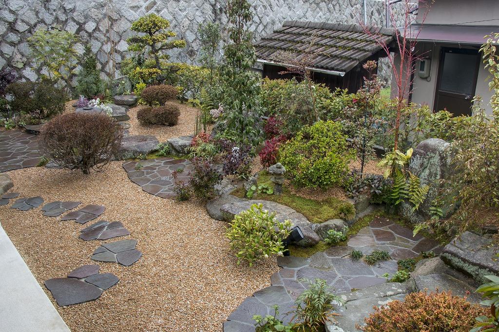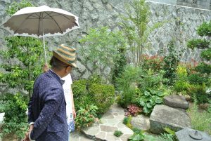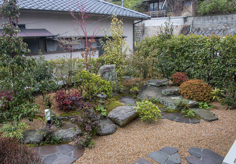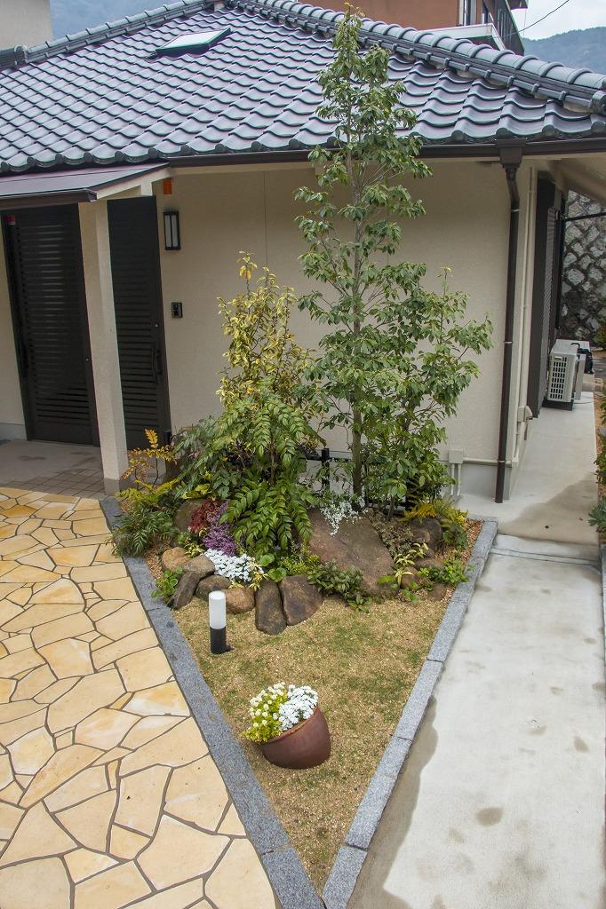 “庭園デザイナー”石原和幸氏と共同で、寂しくなったお庭の改修に挑みました。古いウバメガシや立派な景石がお庭を飾っていましたが、色が少なく奥行きの感じにくいお庭になっていました。石原氏は、このお庭に広がりを持たせるため、高さ3mのトネリコや足元を飾る組・ギルドエッジなど様々なサイズの植物を配置しました。また、サンゴモミジやユキャナギなどを植えることで、年中楽しめるお庭をつくりました。