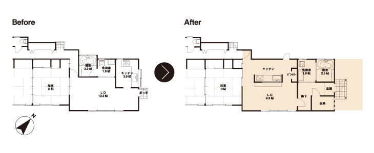 絶景!階段の上のスタイリッシュなお家 2015年11月10日 リノベーション 床も壁も家具も全部やわらかな白で統一。 床は大理石調のフローリングを貼る事により、都会の高級マンションの様な スタイリッシュな空間を演出しました。 施工事例ギャラリー 物件詳細情報 施工箇所 増築、全面リフォーム 住宅形状 戸建 築年数 約25年 施工面積 66㎡ 工期 2ヵ月 所在地 広島県呉市 主な設備・素材・工事内容 リノベーション、木造(古民家) 間取り図