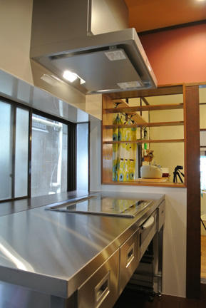 キッチンの天板高さも身長の高い奥様に合わせて少し高めに設定。厨房用キッチンを